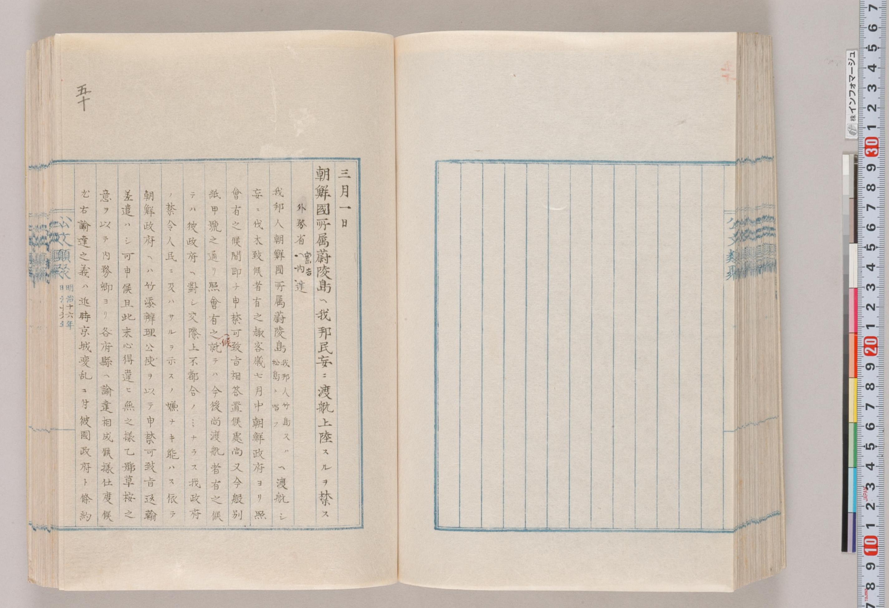 航し、妄に伐採木切木者有之趣客歳七月中朝鮮政府より照会有之候。間即ち申禁可致告相答置候処、尚又今般別紙甲に通り照会有之候。就ては今後尚渡航者有之候ては彼政府へ対し交際上不都合のみならず、我政府の禁令人民に及ばざるを示すの体なき能はず。依て朝鮮政府へは竹添理公使を以って申禁可致●返翰差遣わし可申し候。且此未心得達ひ無之様乙号●禁●意を以て内務卿より各府県へ諭達相成候様仕度候尤、右諭達之義は近時京城辺乱に付、彼国政府と條約交換有之際にて同国使節も滞京中の事に候へは、其等に因縁候儀に世上へ感触を来し候ては不都合に被存候間諭達文中にも該島に付朝鮮政府との議定せし年月を挿入致置、従来朝鮮国に属し特に今日に定むるものに非ざるを引証し、諭達の意は単に訣島の位置を明示し渡航を禁するに止まるものに有之候。右之次第に付、御発令の義も朝鮮使節帰国相成候上に有之候様仕度此瑕上申候也 [明治十五年十二月十六日]