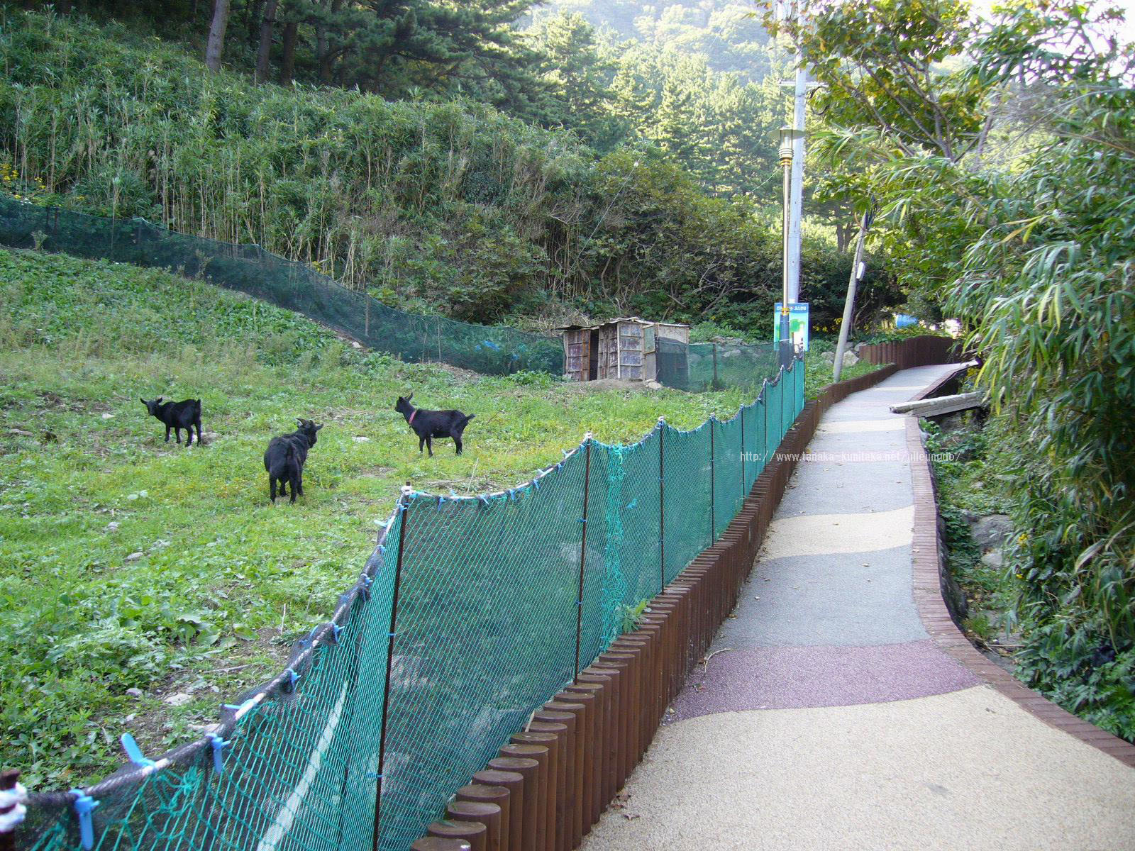 あれはヤギだろうか。その先に何やら看板がある。