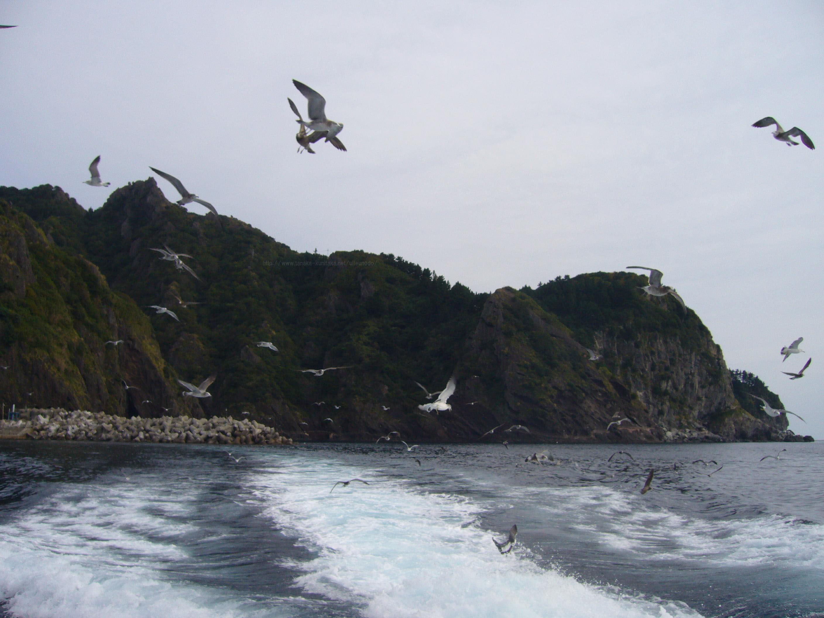 出発直後。一度バックしてから右に舵をきって時計回りに島を回る。これは舵を右に切った直後。船尾から道洞港を望む。