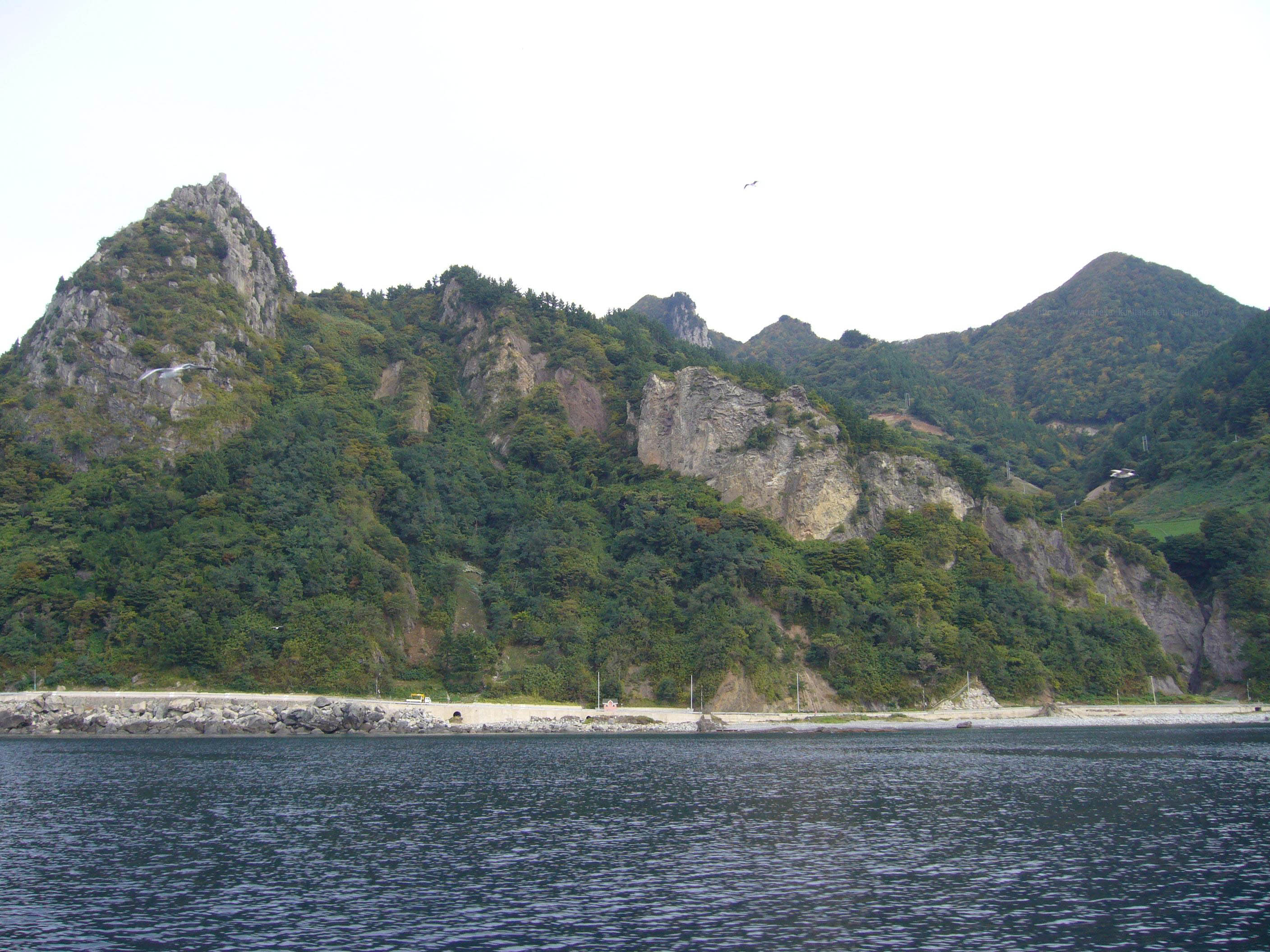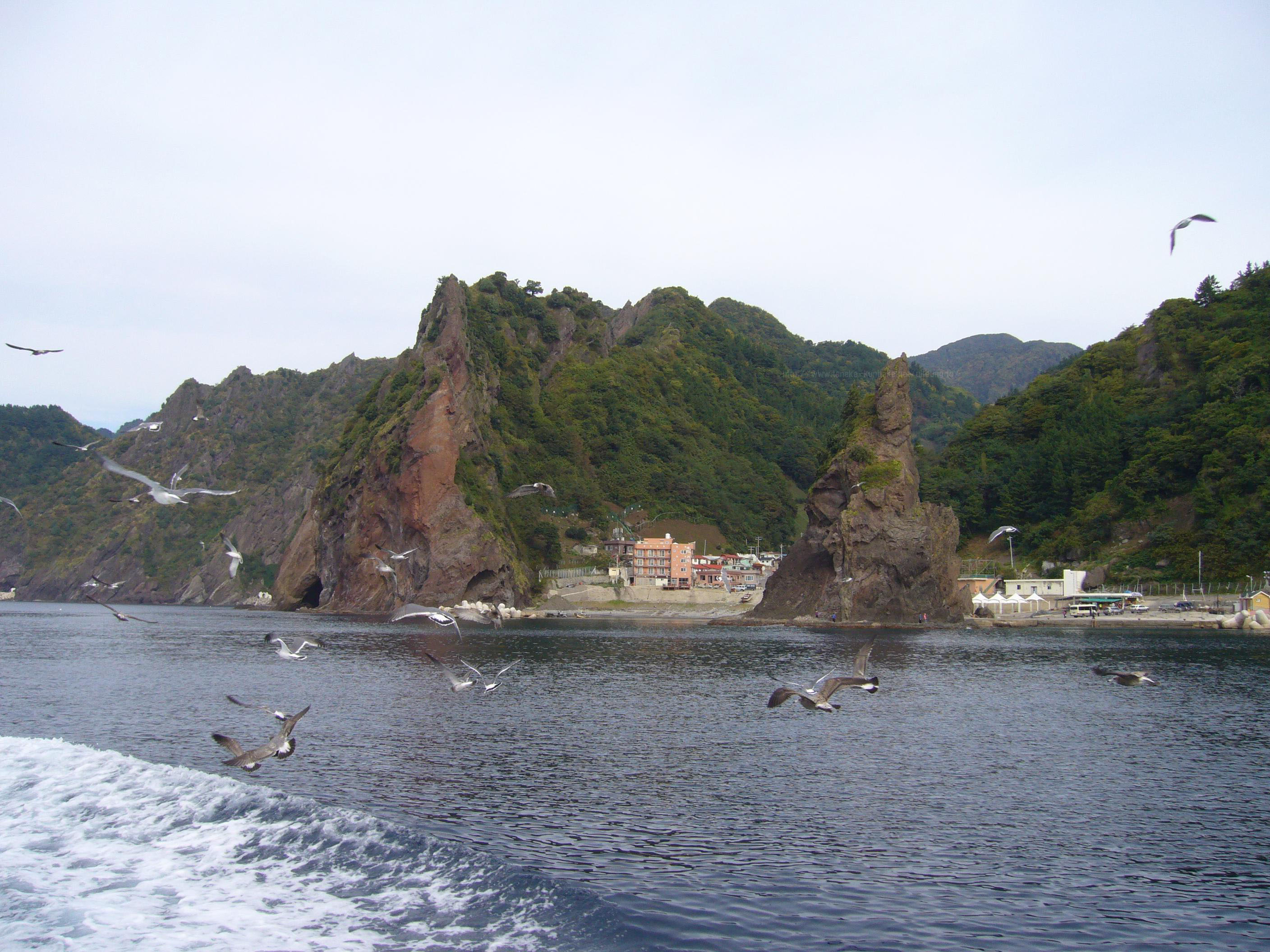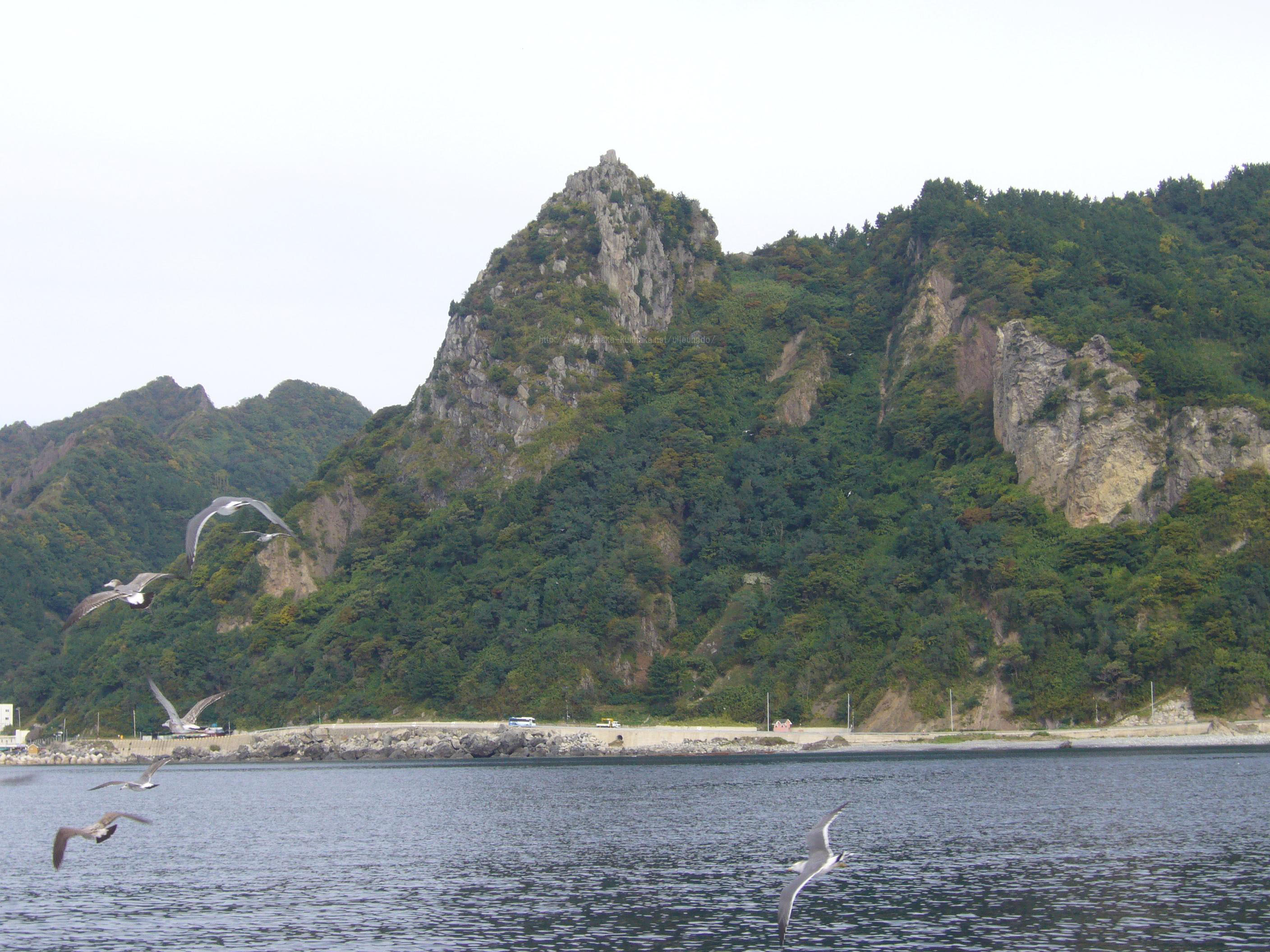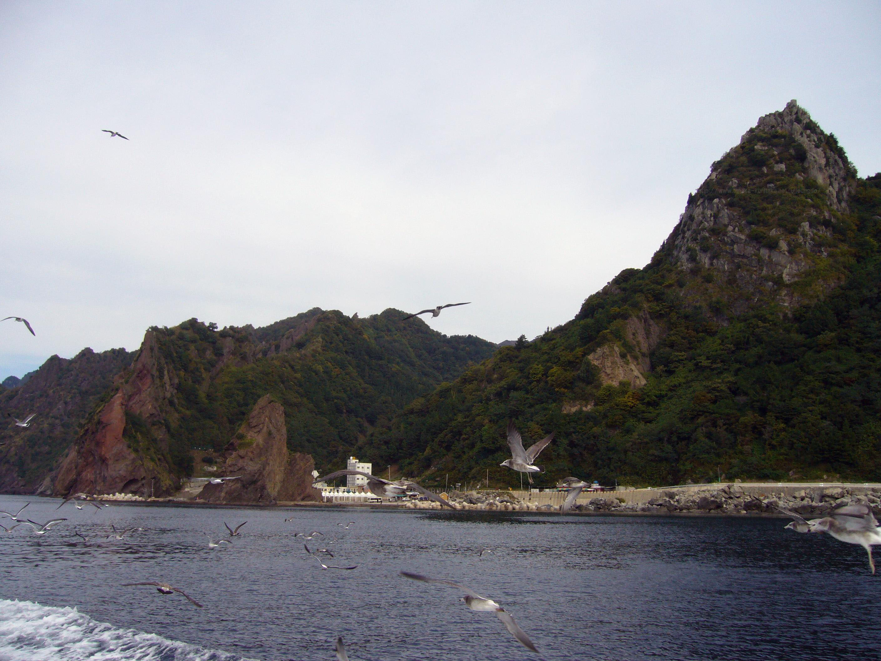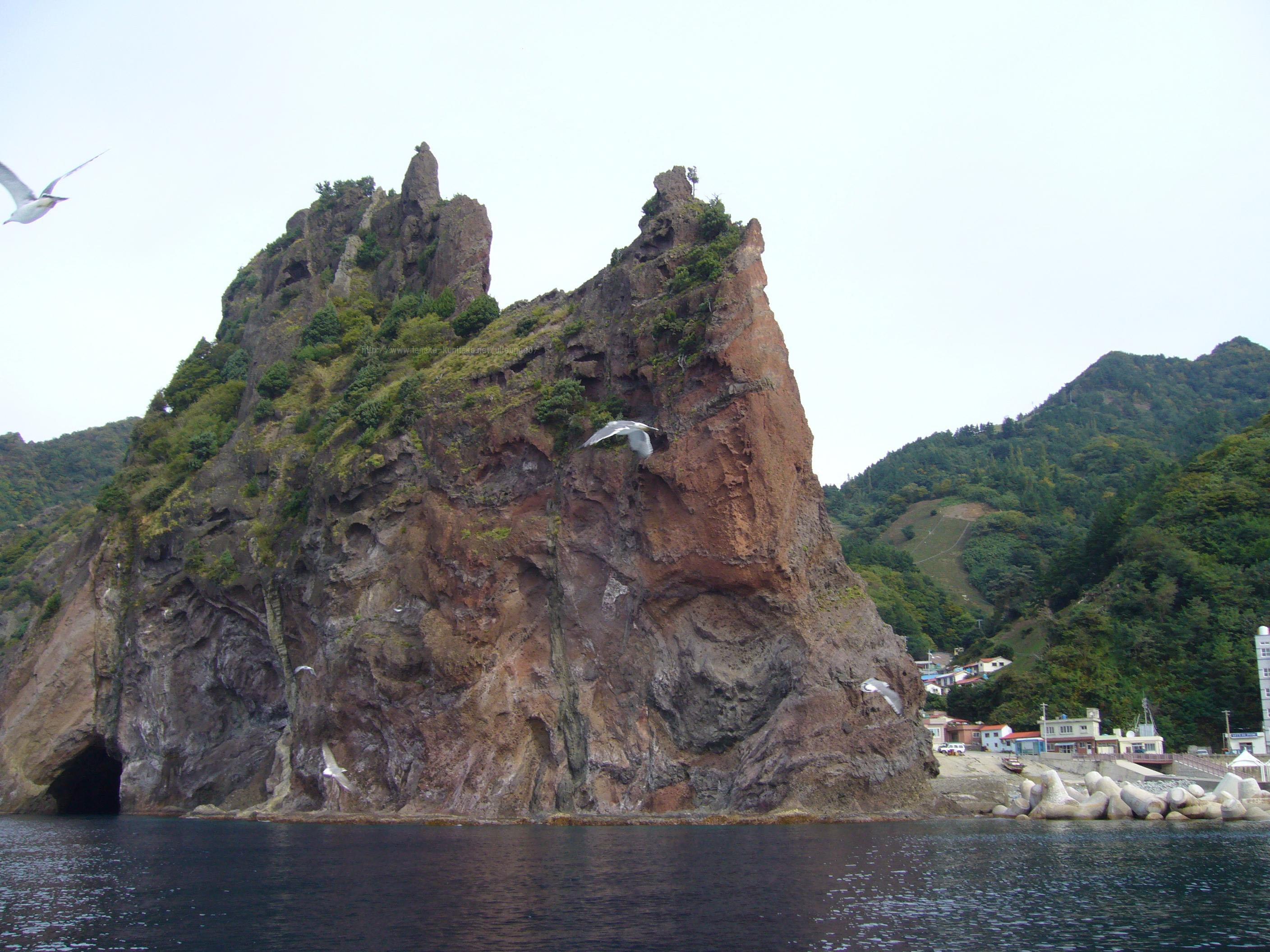 振り返って撮影。岩と岩の間を船が弧を描いて進んだのが分かる。鬱陵島南端には複数の岩礁が存在。