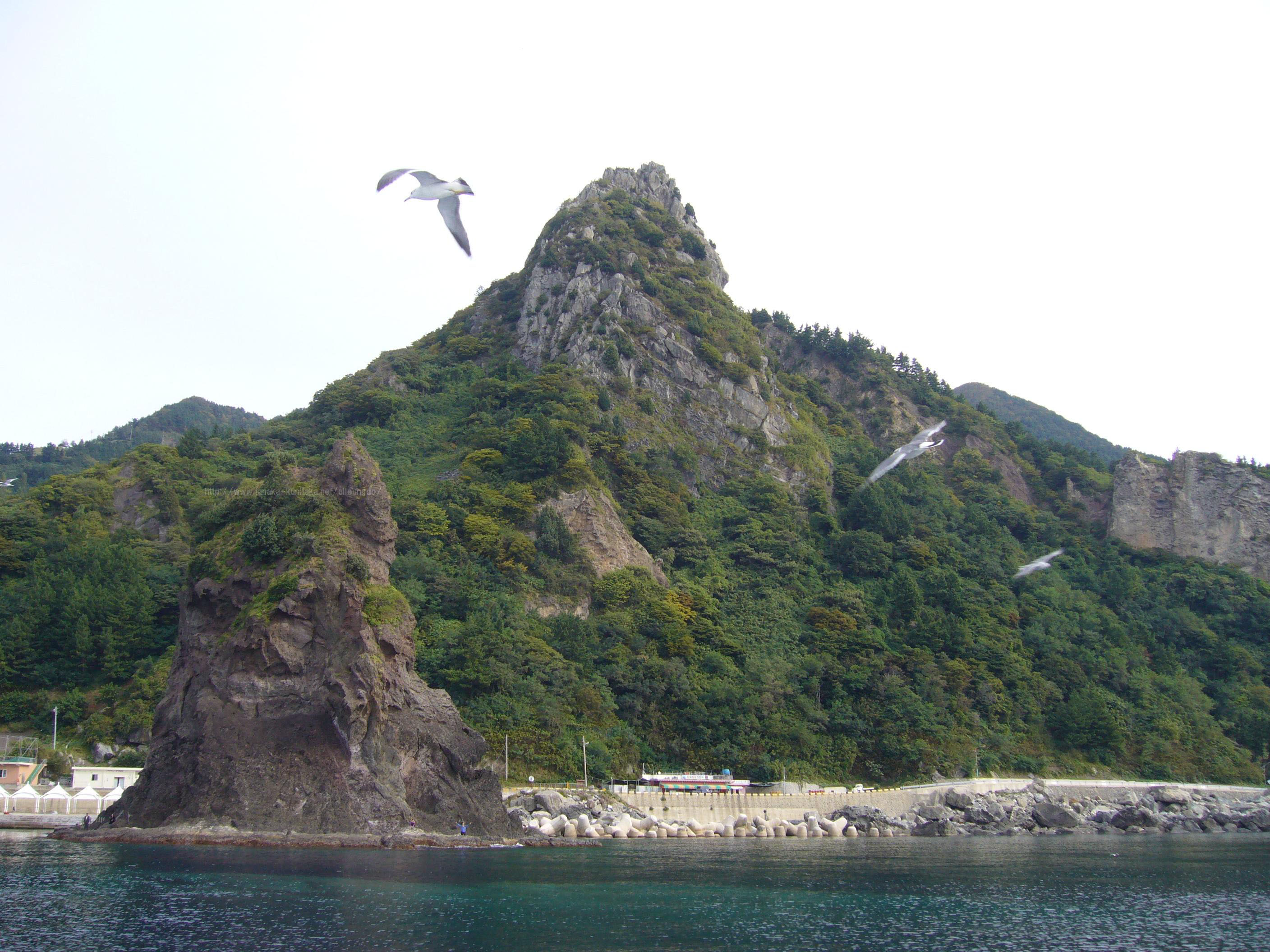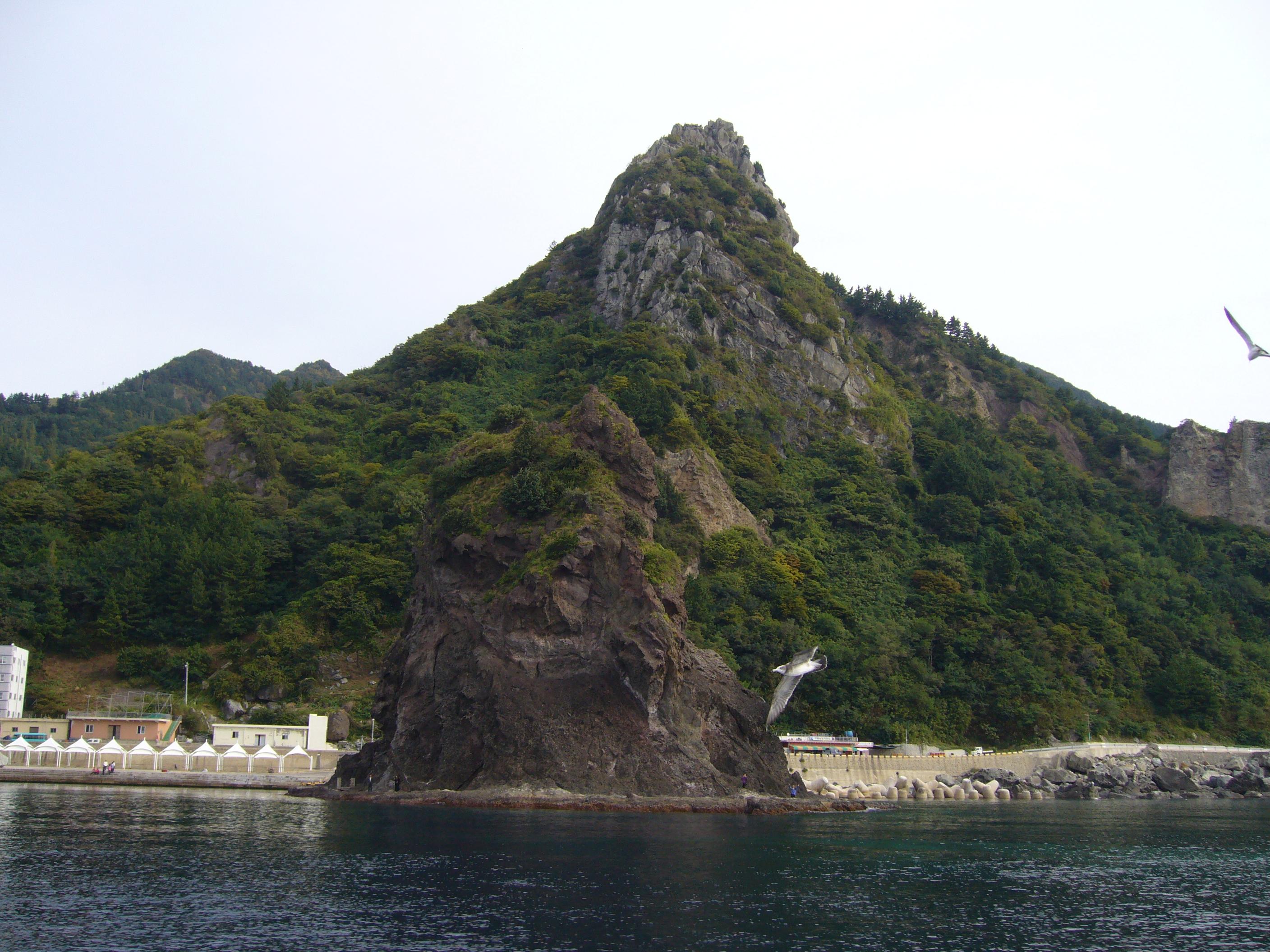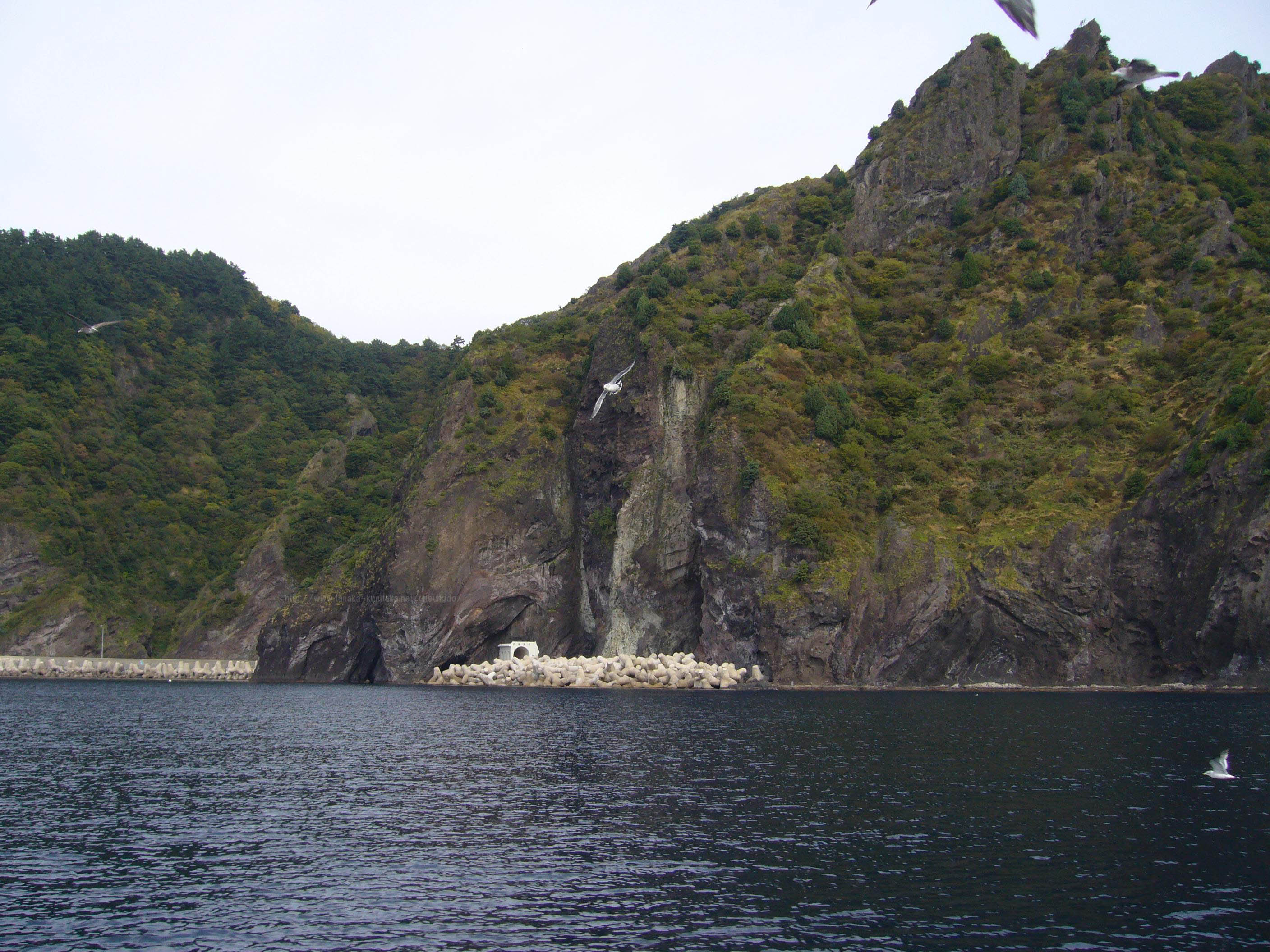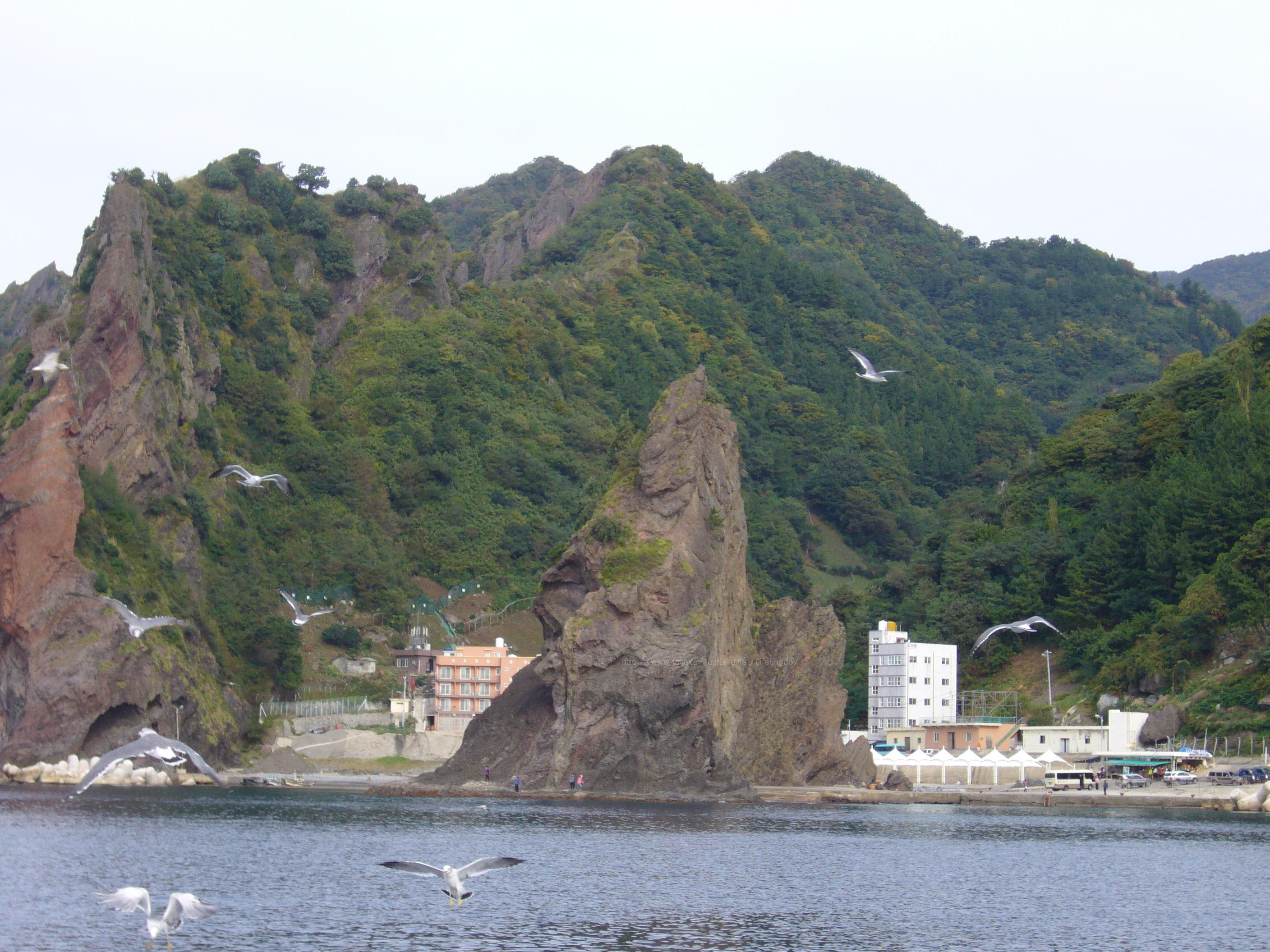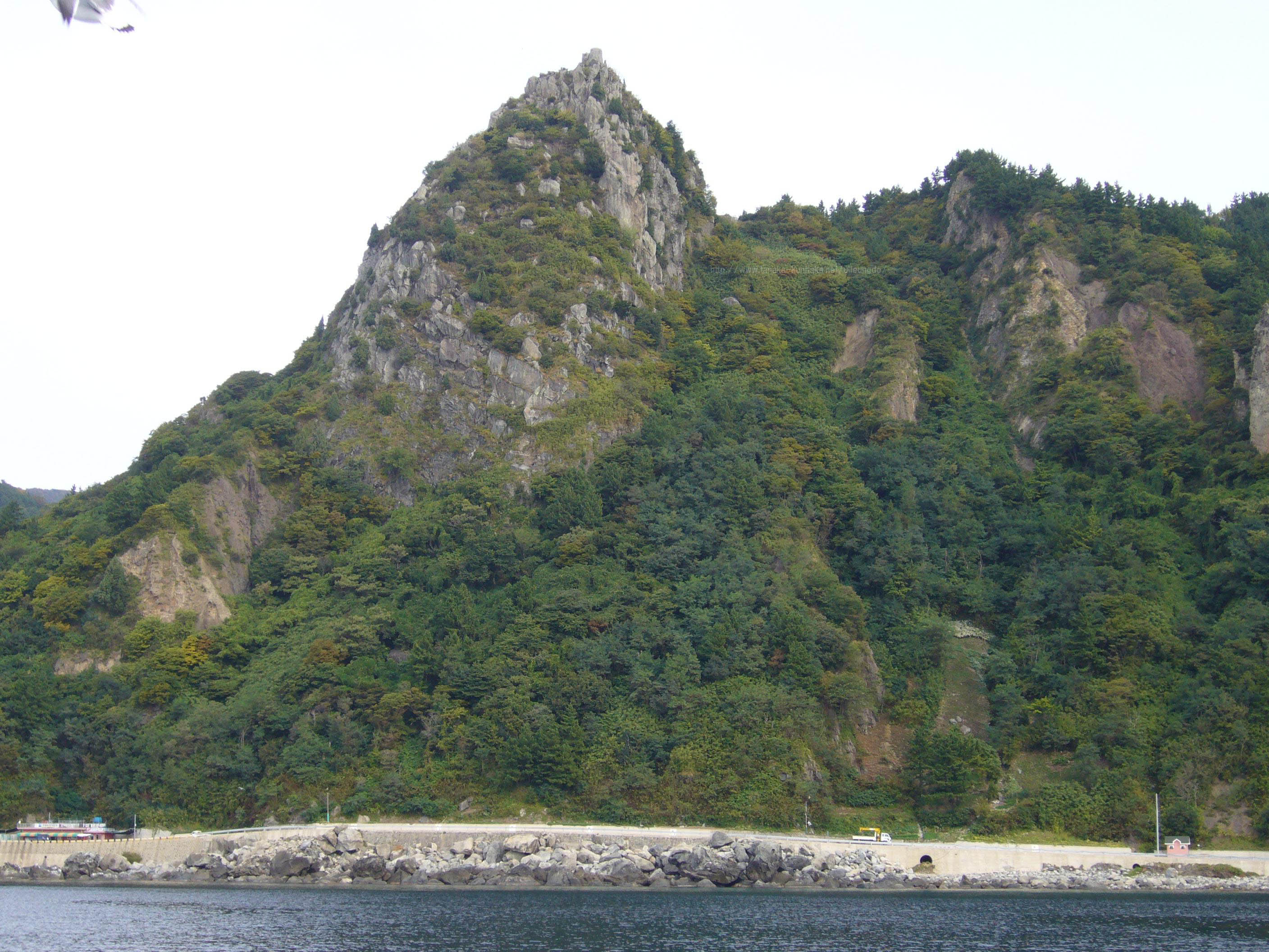 振り返って撮影。岩と岩の間を船が弧を描いて進んだのが分かる。鬱陵島南端には複数の岩礁が存在。