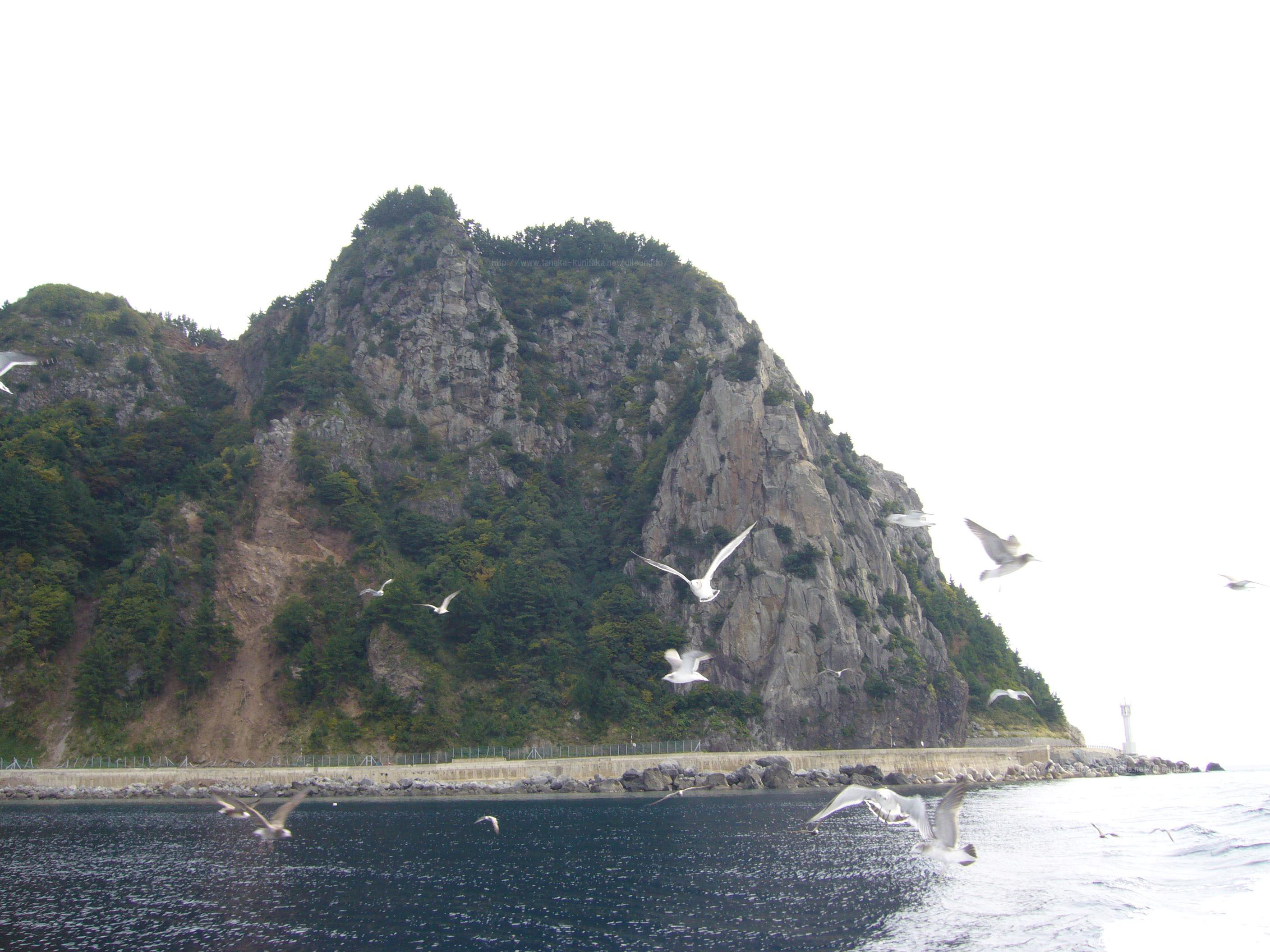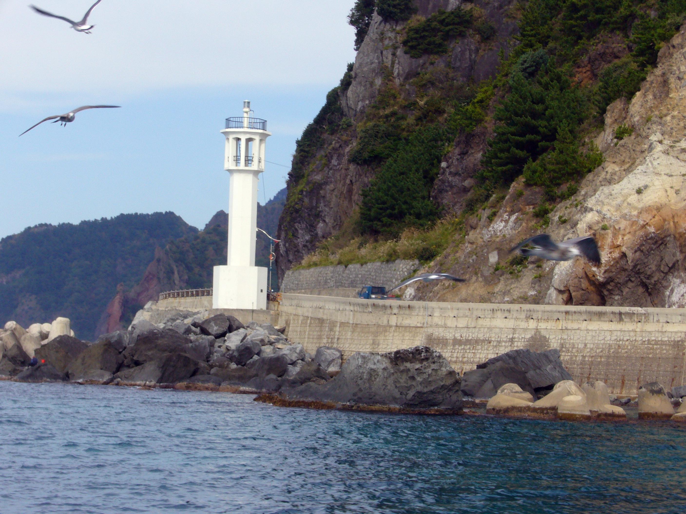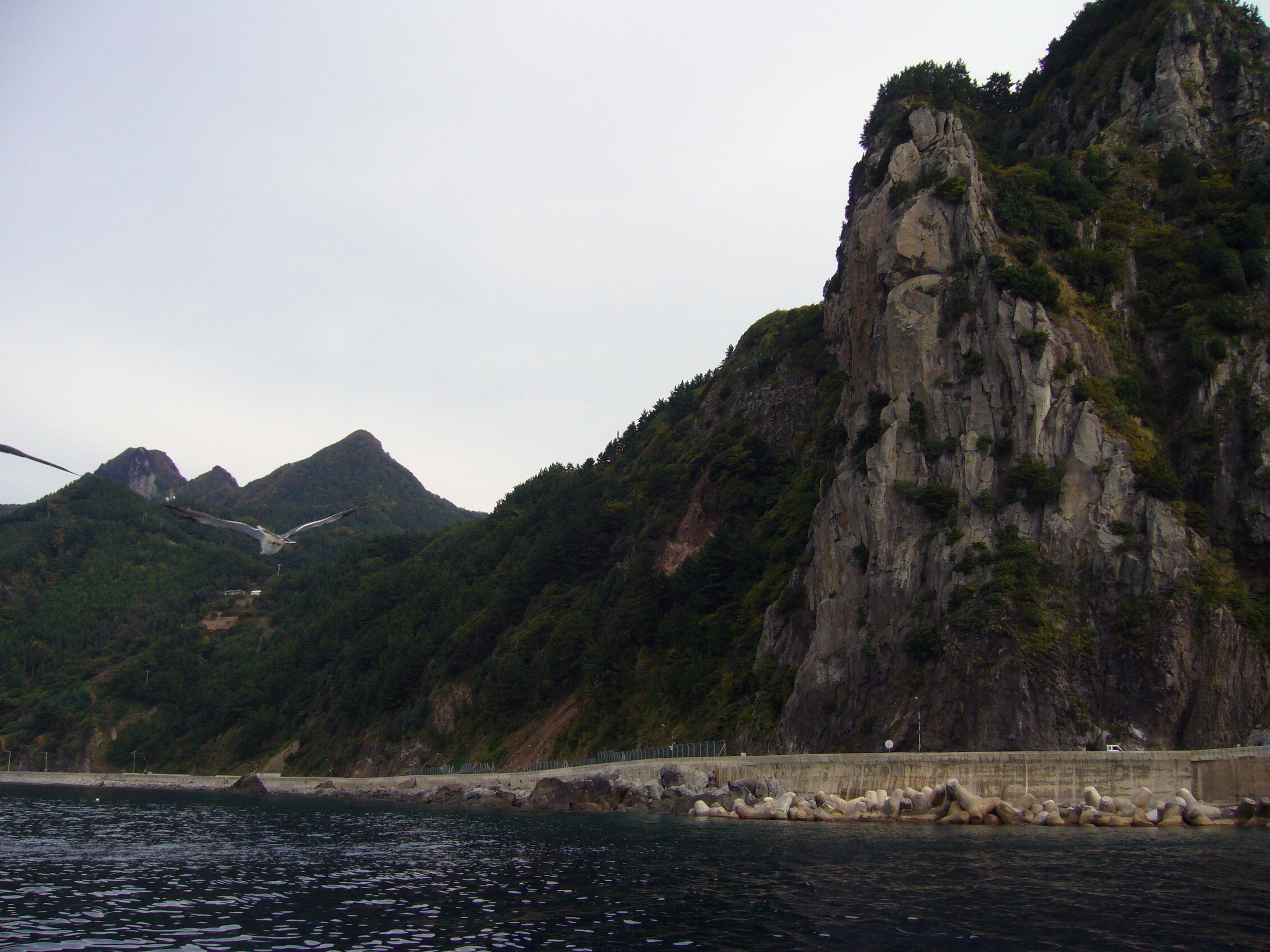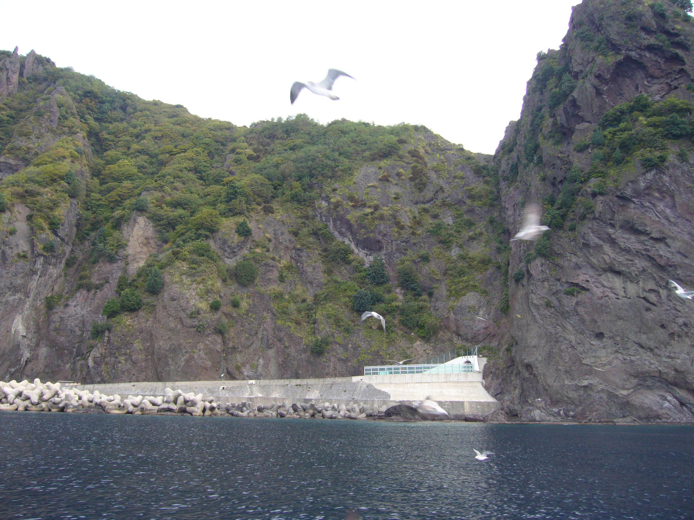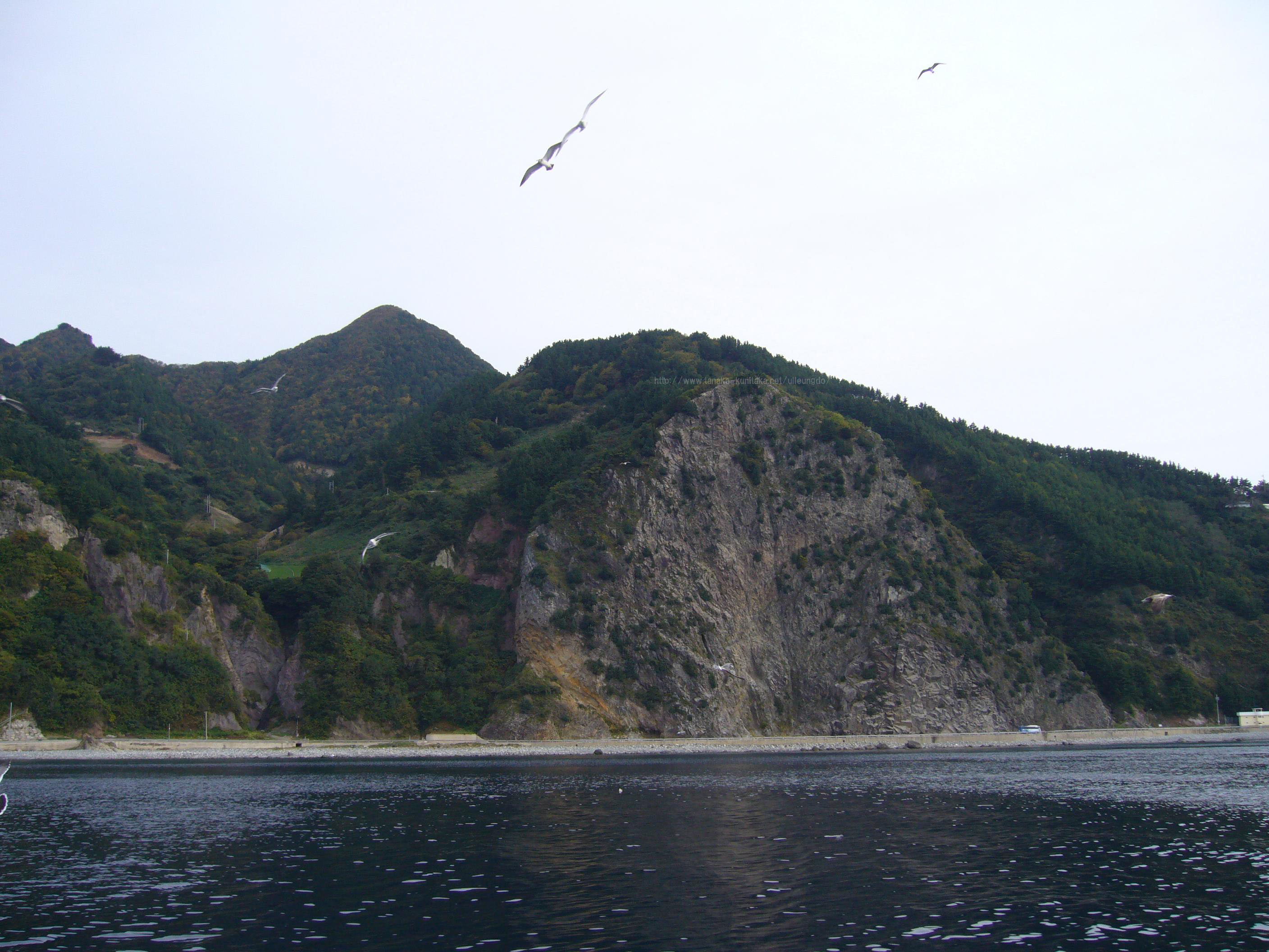 振り返って撮影。岩と岩の間を船が弧を描いて進んだのが分かる。鬱陵島南端には複数の岩礁が存在。