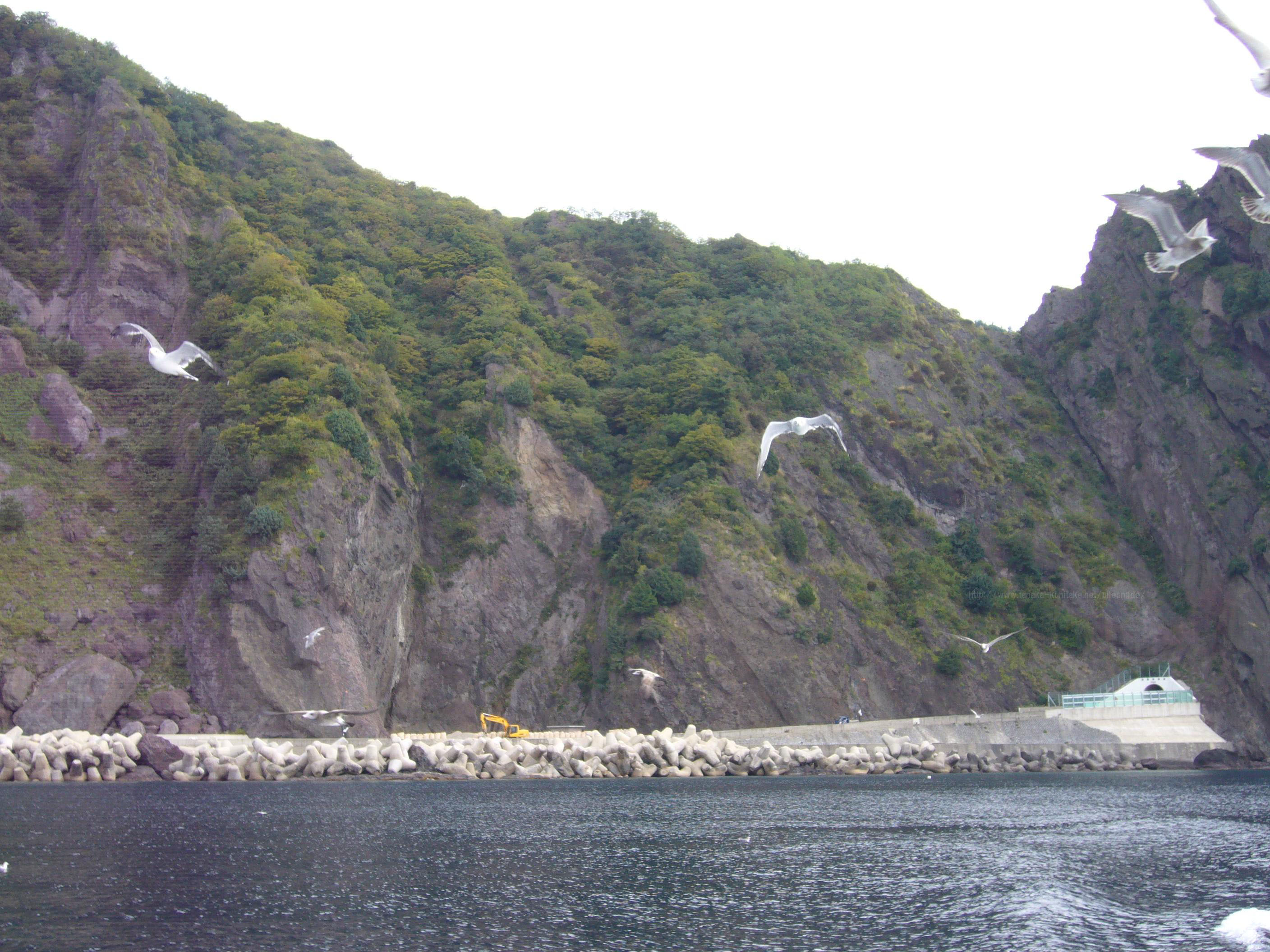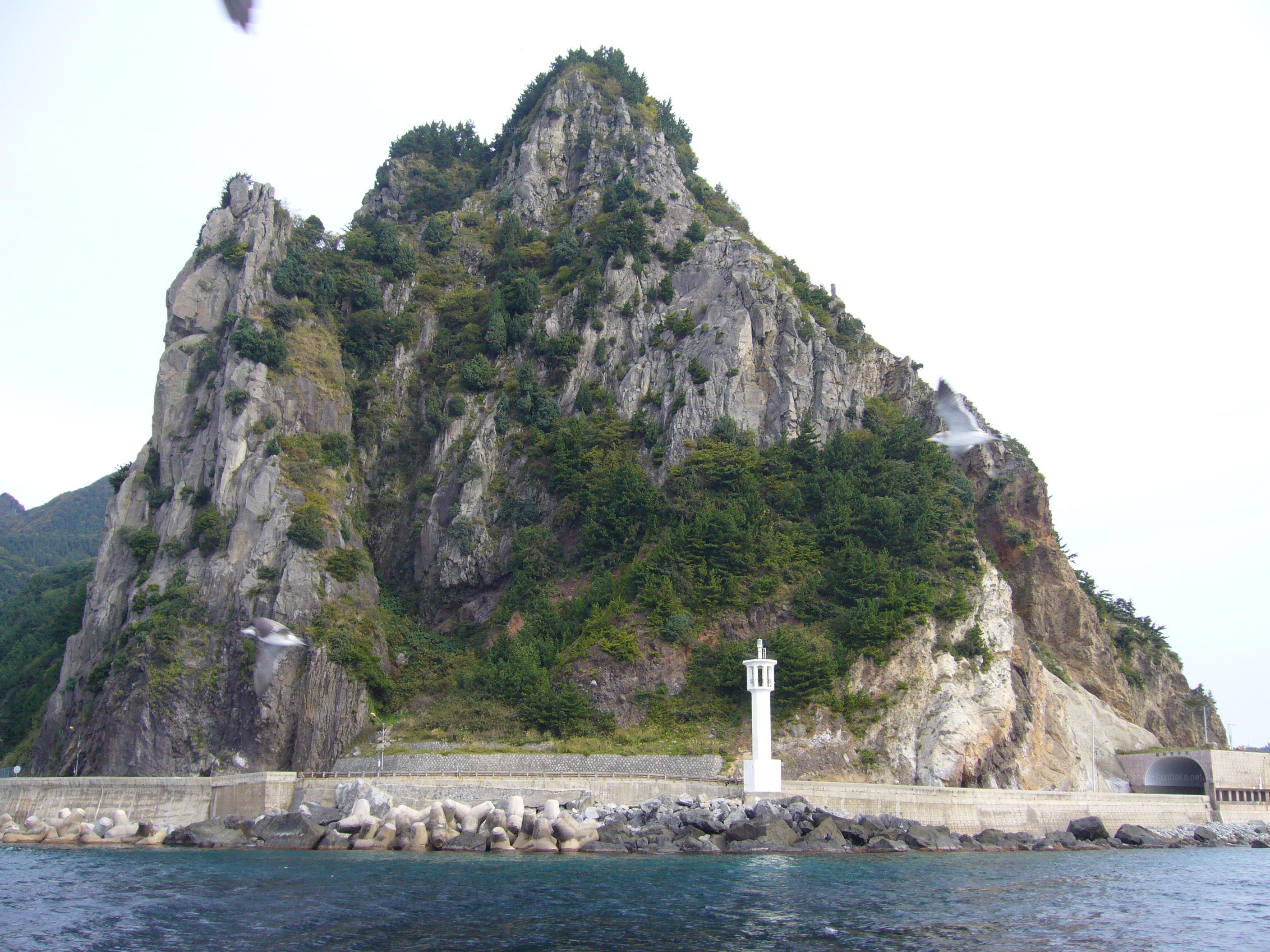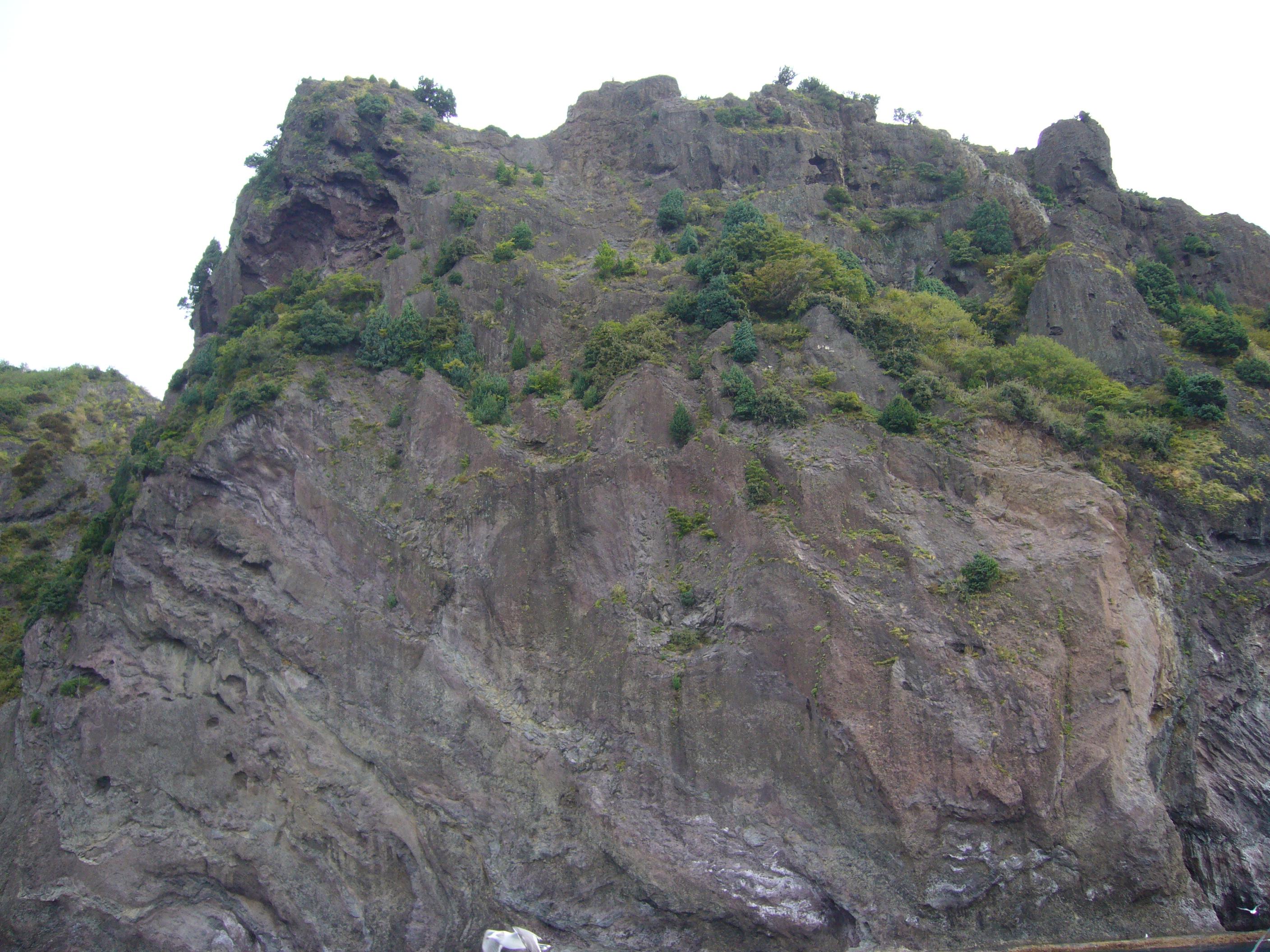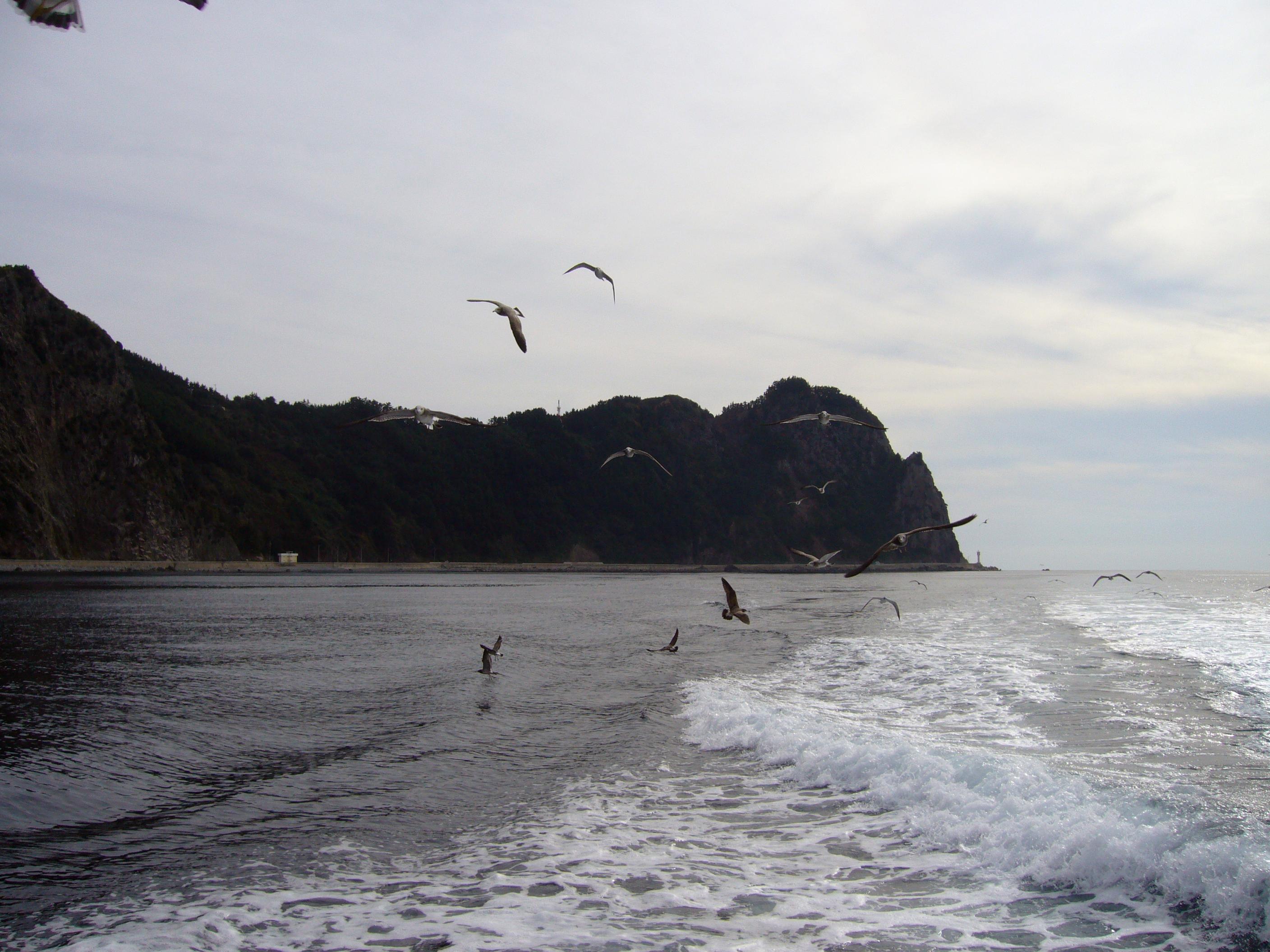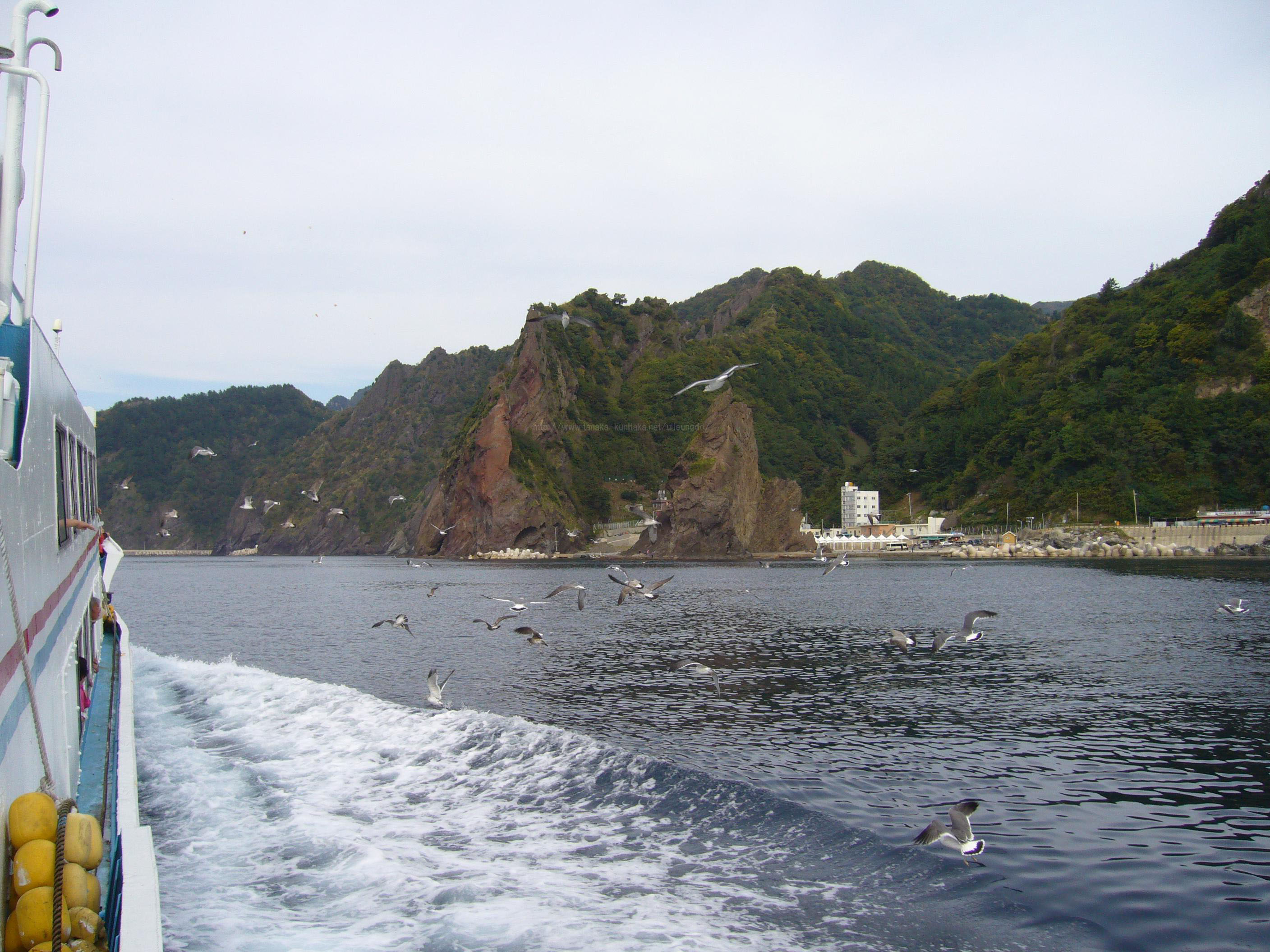 振り返って撮影。岩と岩の間を船が弧を描いて進んだのが分かる。鬱陵島南端には複数の岩礁が存在。