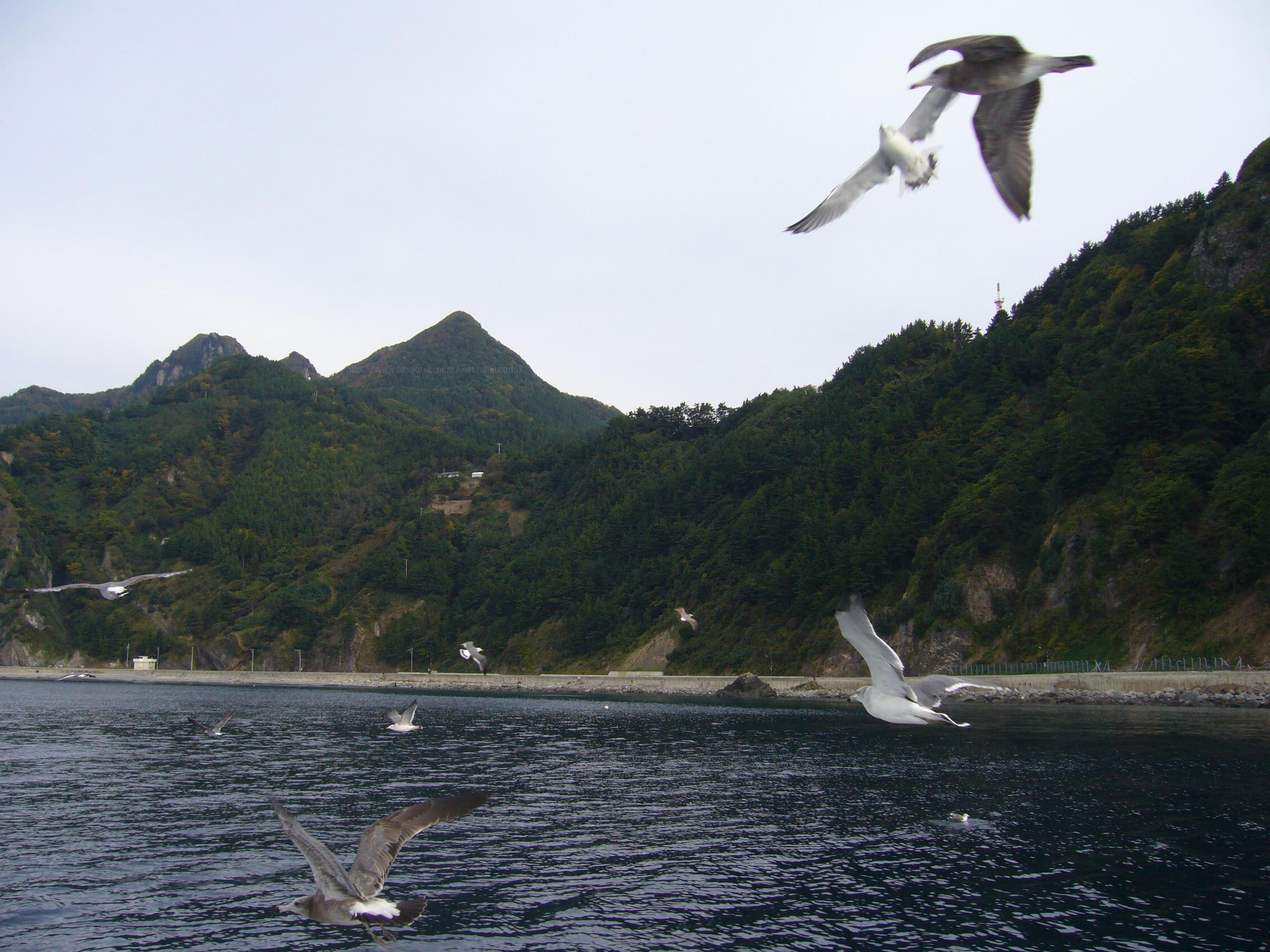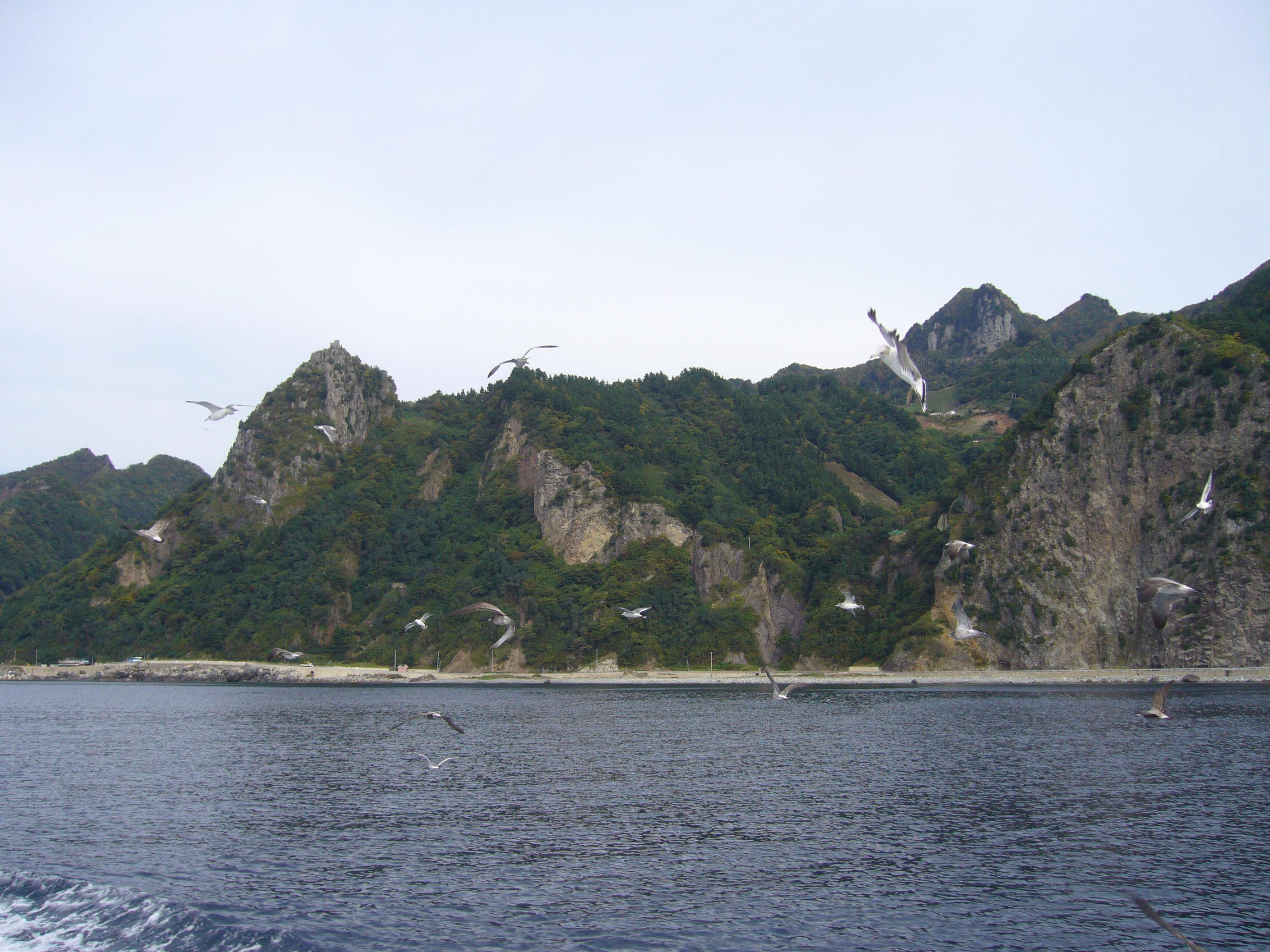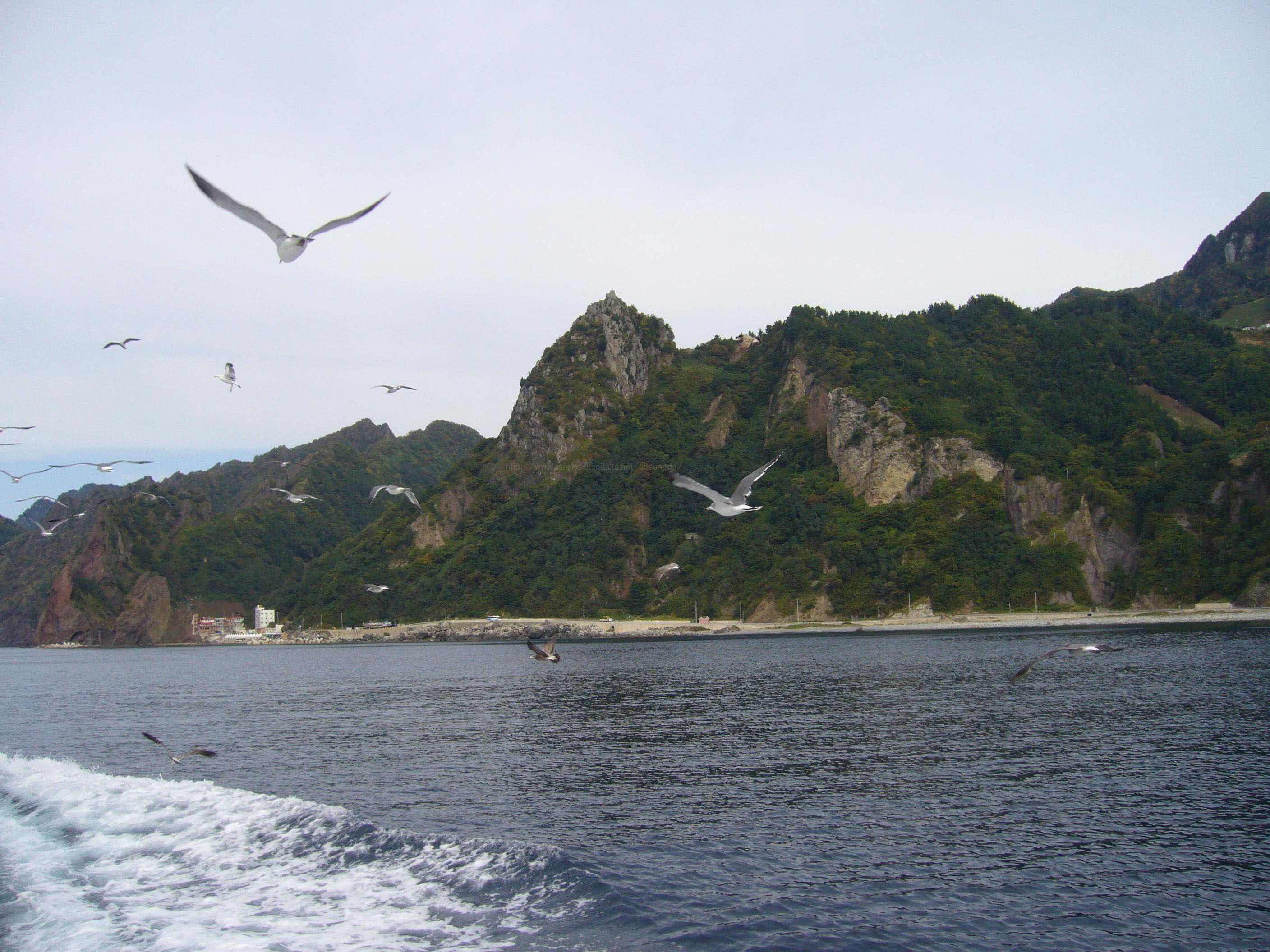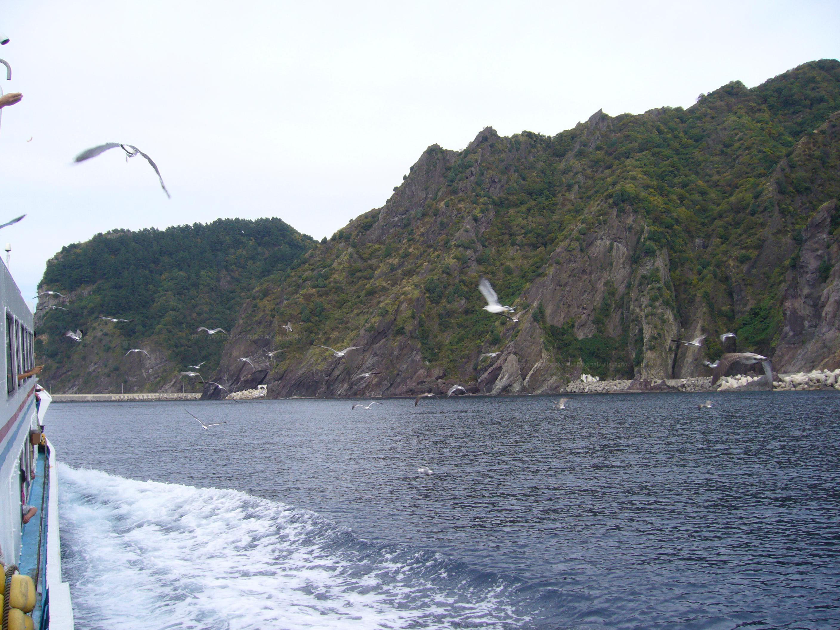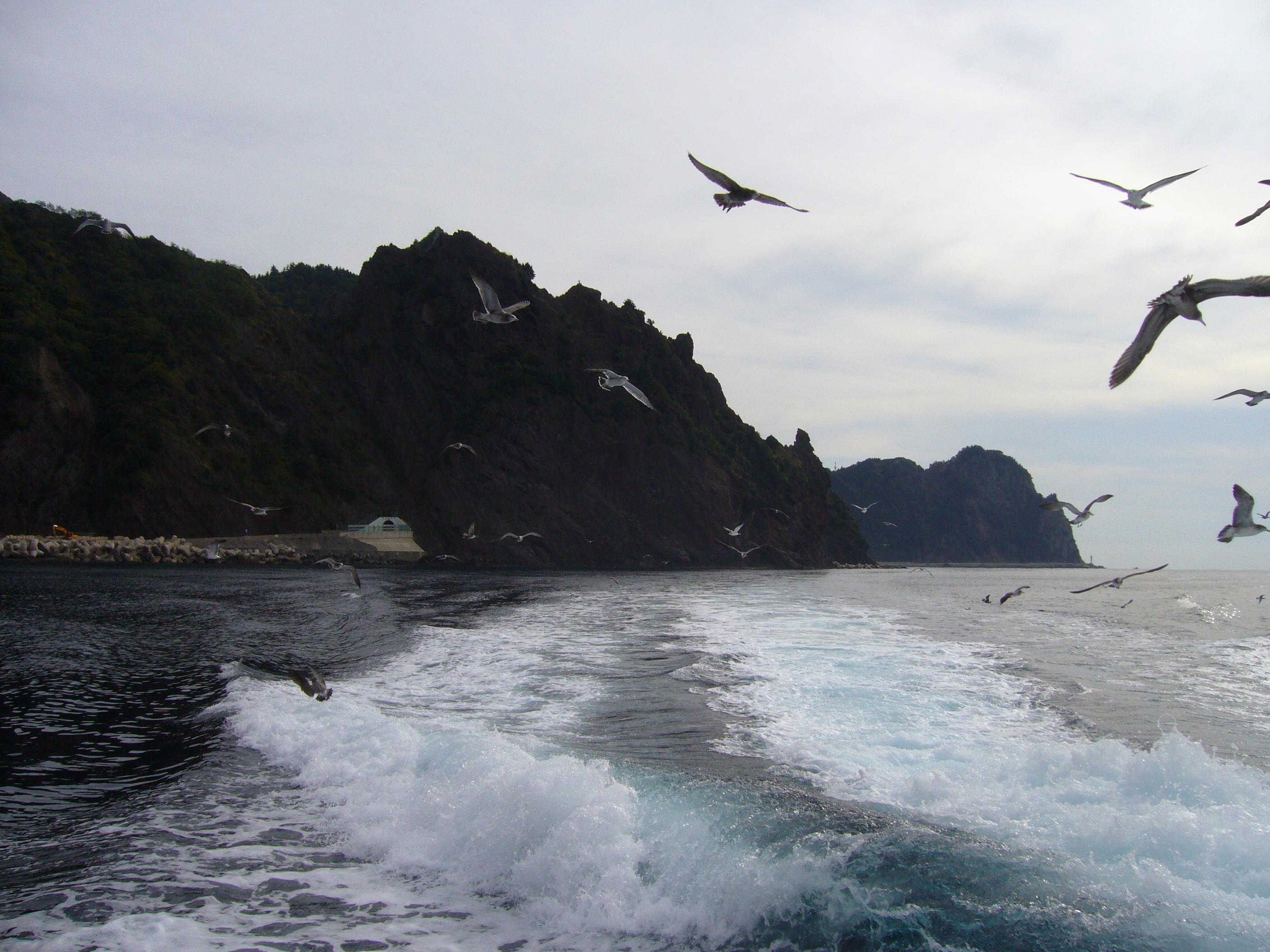 振り返って撮影。岩と岩の間を船が弧を描いて進んだのが分かる。鬱陵島南端には複数の岩礁が存在。